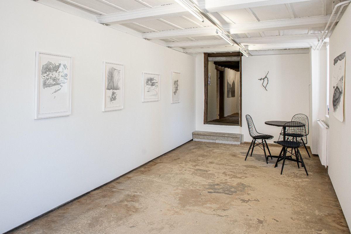 In den Händen und unter dem Blick von Monika Feucht (*1956, Luzern) verwandelt sich Schweres in Leichtes, Flüchtiges wird Dinghaft, Versteinertes beginnt zu tanzen. In ihrer ersten Ausstellung in der Galerie Rössli wird dies mit den filigranen, an kleinen Metallständer hängenden Formen in der Fensterauslage und den beiden grossformatigen Schmetterlings-Zeichnungen im dritten Raum eindrucksvoll sichtbar. Spiriti dei Marmi und Ephemer, so die Titel der beiden Werkgruppen, bilden die Klammer einer Ausstellung, in der die Verwandlung, die Metamorphose, immer wieder zum inhaltlichen und motivischen Programm wird.